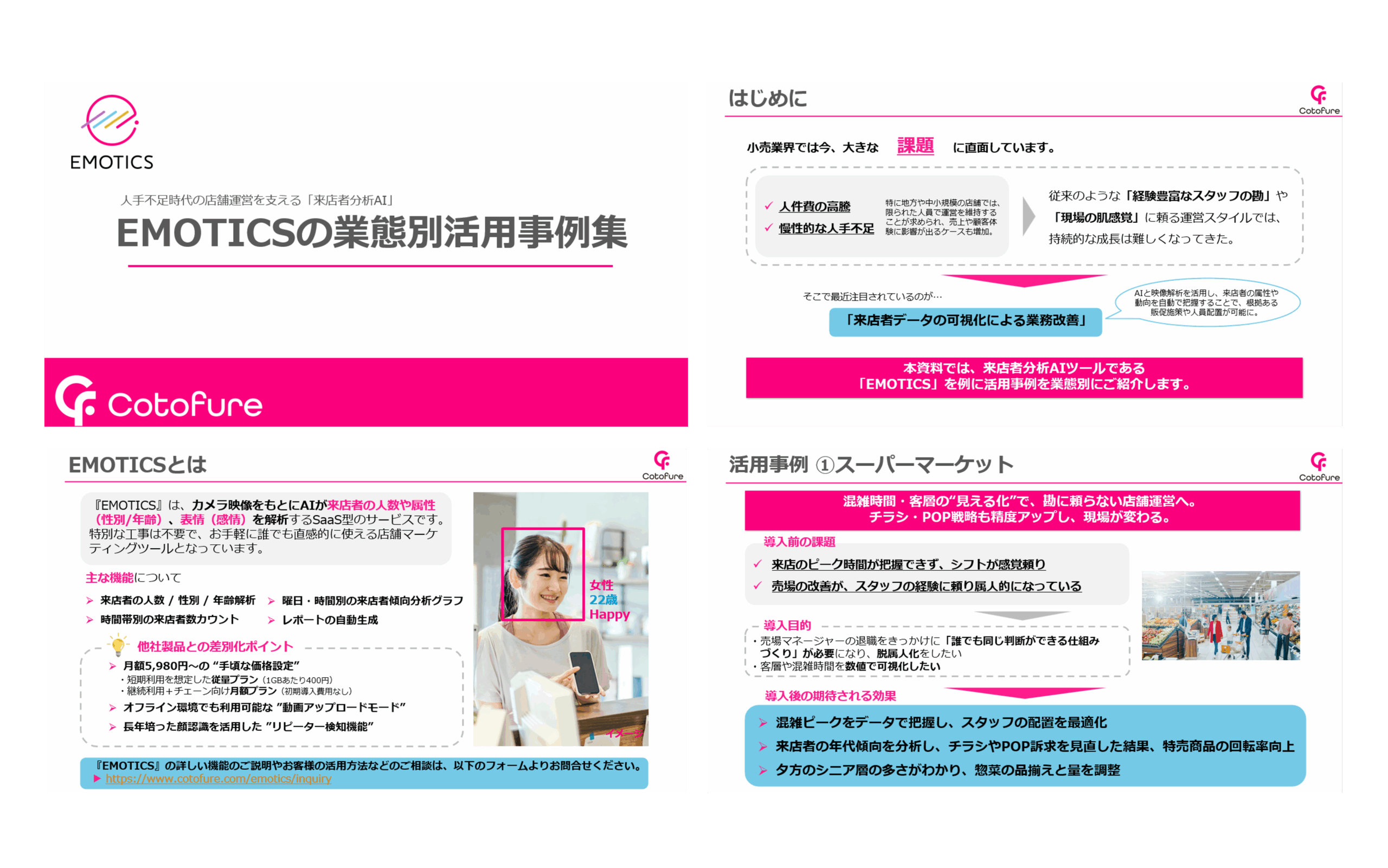 小売の各業態での店舗改善や販促最適化の具体例を紹介します。EMOTICSが提供する “見える化” でどのような成果や改善ができるのかお伝えします。