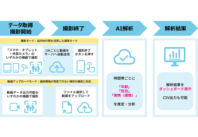 店内Wi-Fiを活用する『撮影モード』と、通信環境が用意できない場所での活用に対応した『動画アップロードモード』のどちらでもAI分析が可能です。